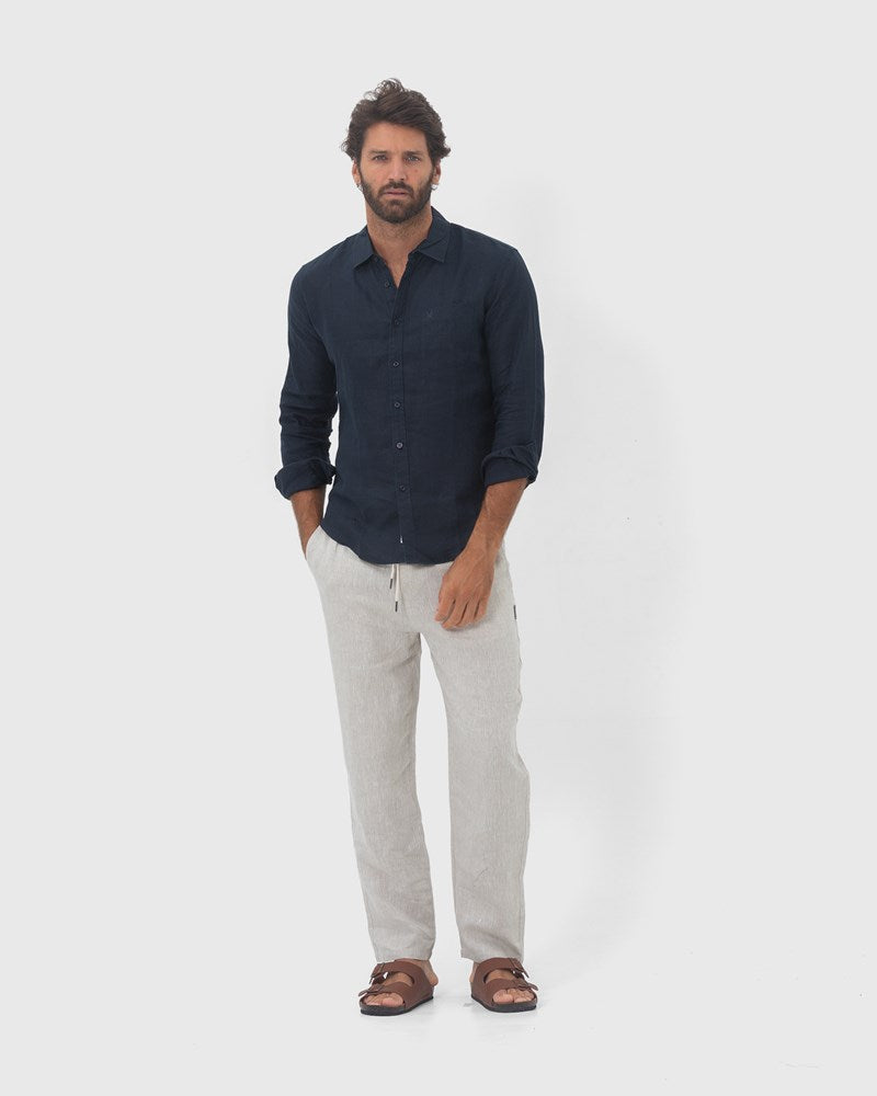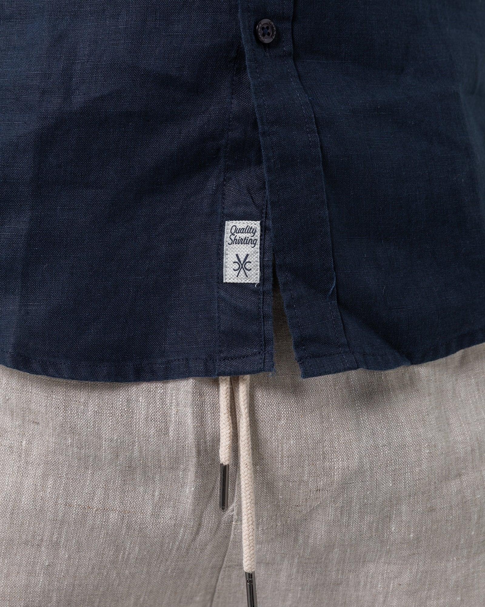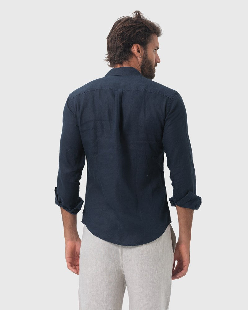 Crafted from high-quality, breathable linen, this shirt ensures you stay cool and comfortable throughout the day. The rich navy color adds a touch of timeless style and versatility, making it a staple piece for any wardrobe. Designed with a relaxed fit and traditional button-down front, this shirt offers a polished yet casual look suitable for various occasions. The long sleeves provide extra coverage, ideal for transitioning from day to night.