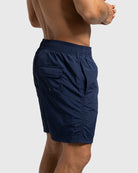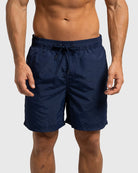 The Essential Navy Swim Shorts showcase an array of features that set them apart, combining fashion-forward design with practicality. Our featured model confidently sports a size medium (AU), standing at an impressive height of 186cm (6'1"), with a chest circumference of 104cm (40") and a waist measurement of 86cm (33").