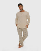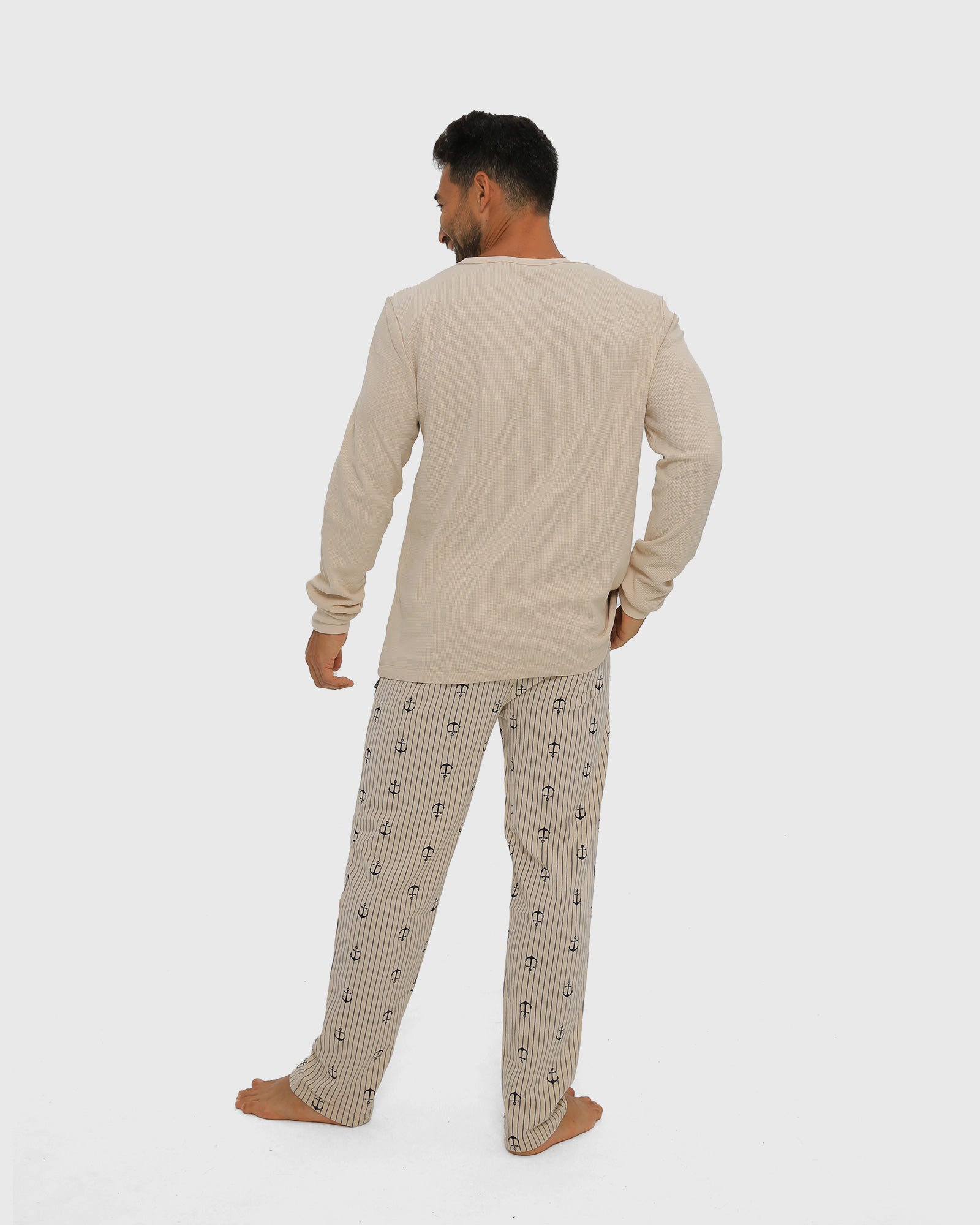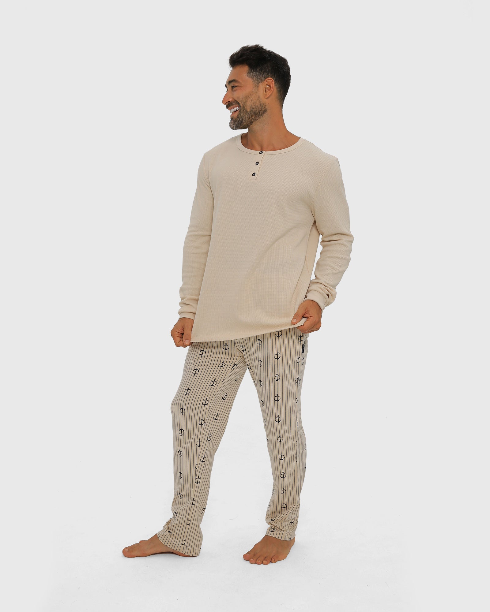 Anchor down in comfort with this cozy 2-piece winter PJ set. Made from 100% soft cotton, it features a waffle-textured henley top and anchor-print jersey pants—ideal for warm, stylish lounging all season long.