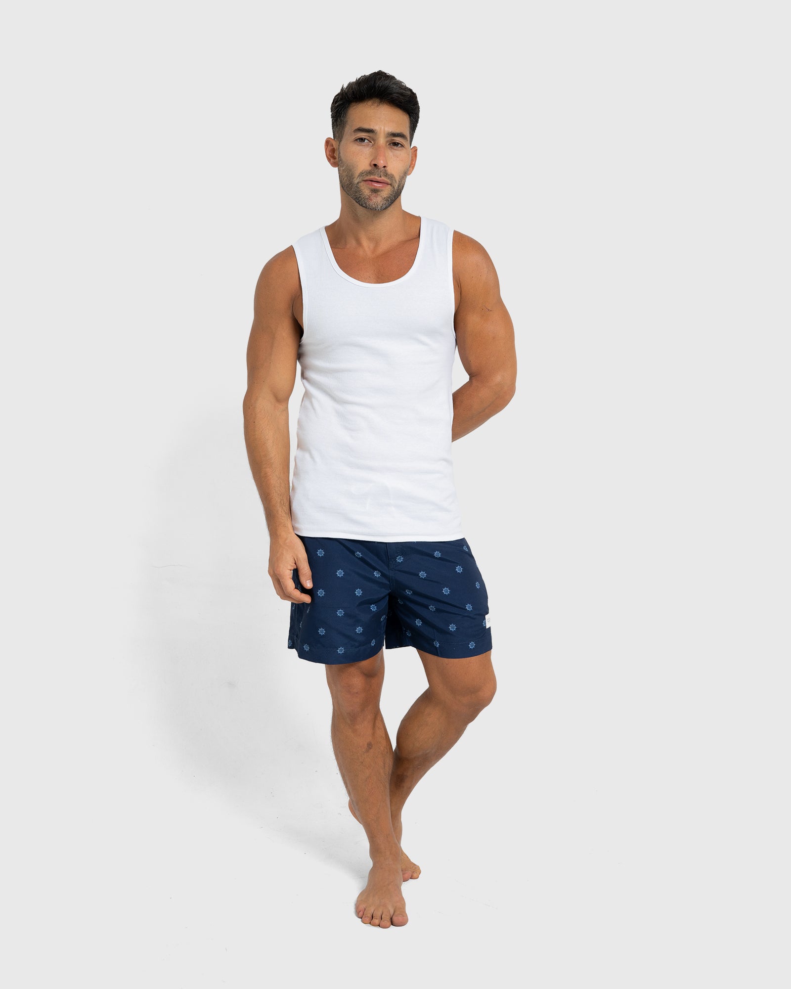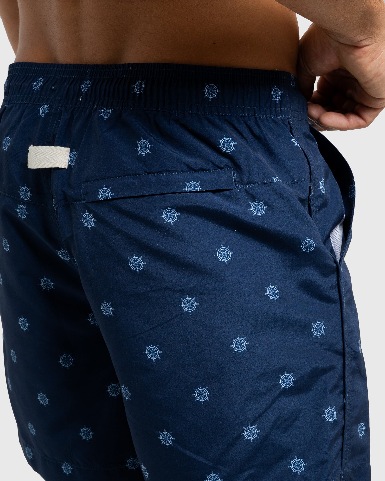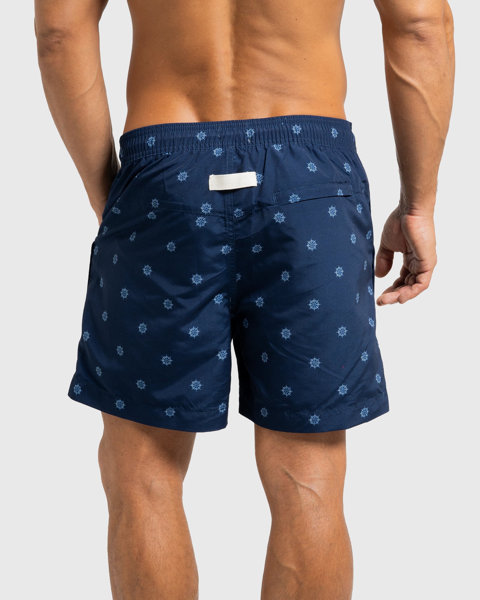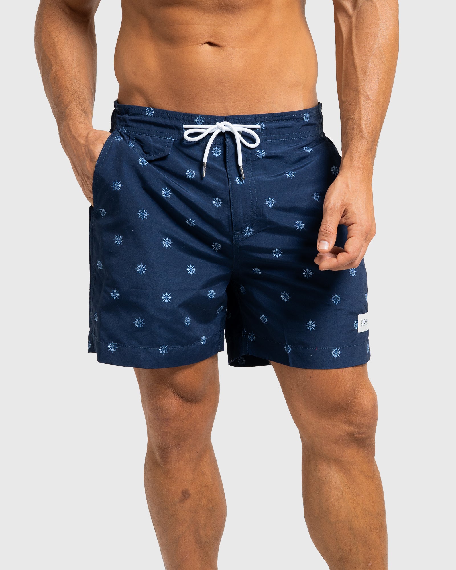Make waves in the Helms Swim Shorts by Coast Clothing. Featuring a nautical white helm print on a navy base, these premium swim shorts are made from 100% recycled plastic bottles for comfort with a conscience.