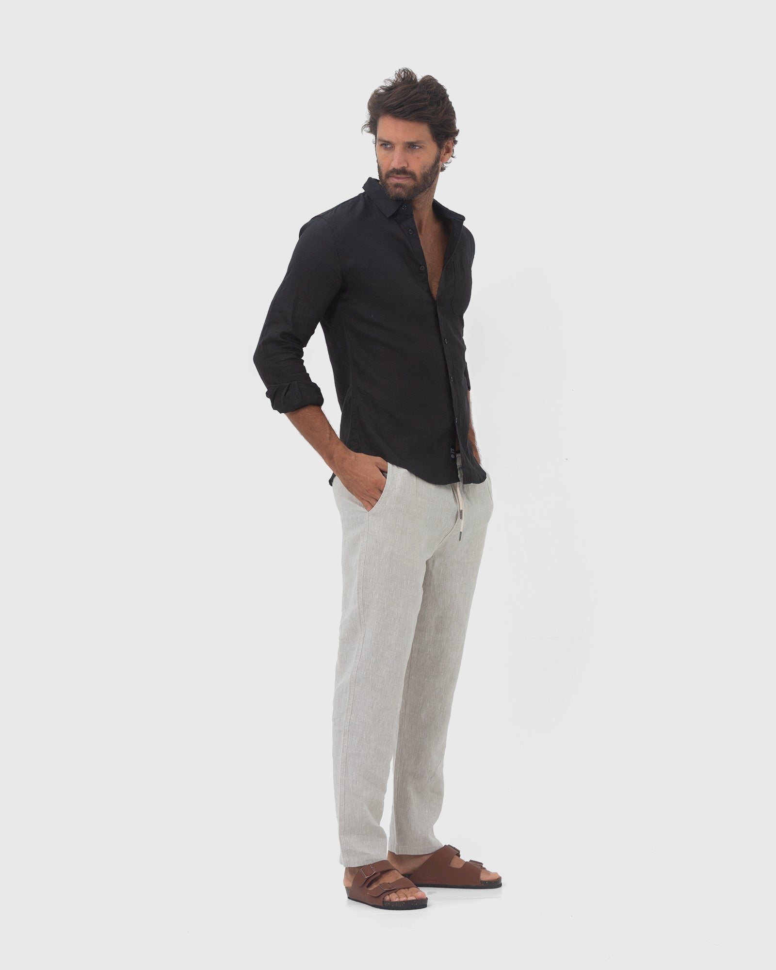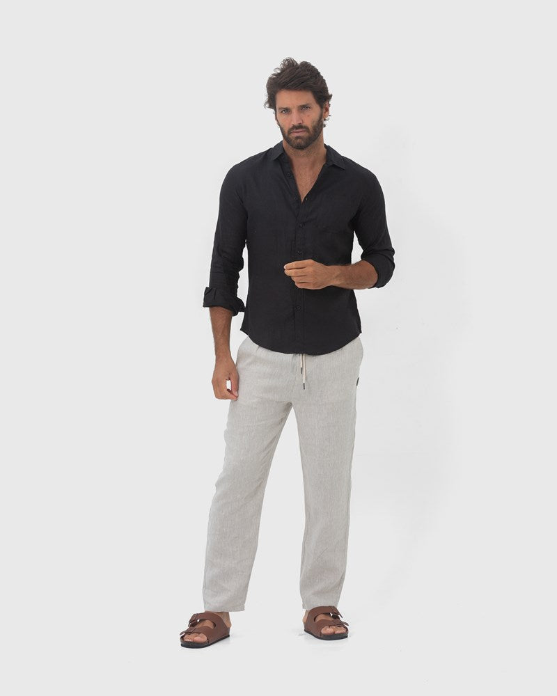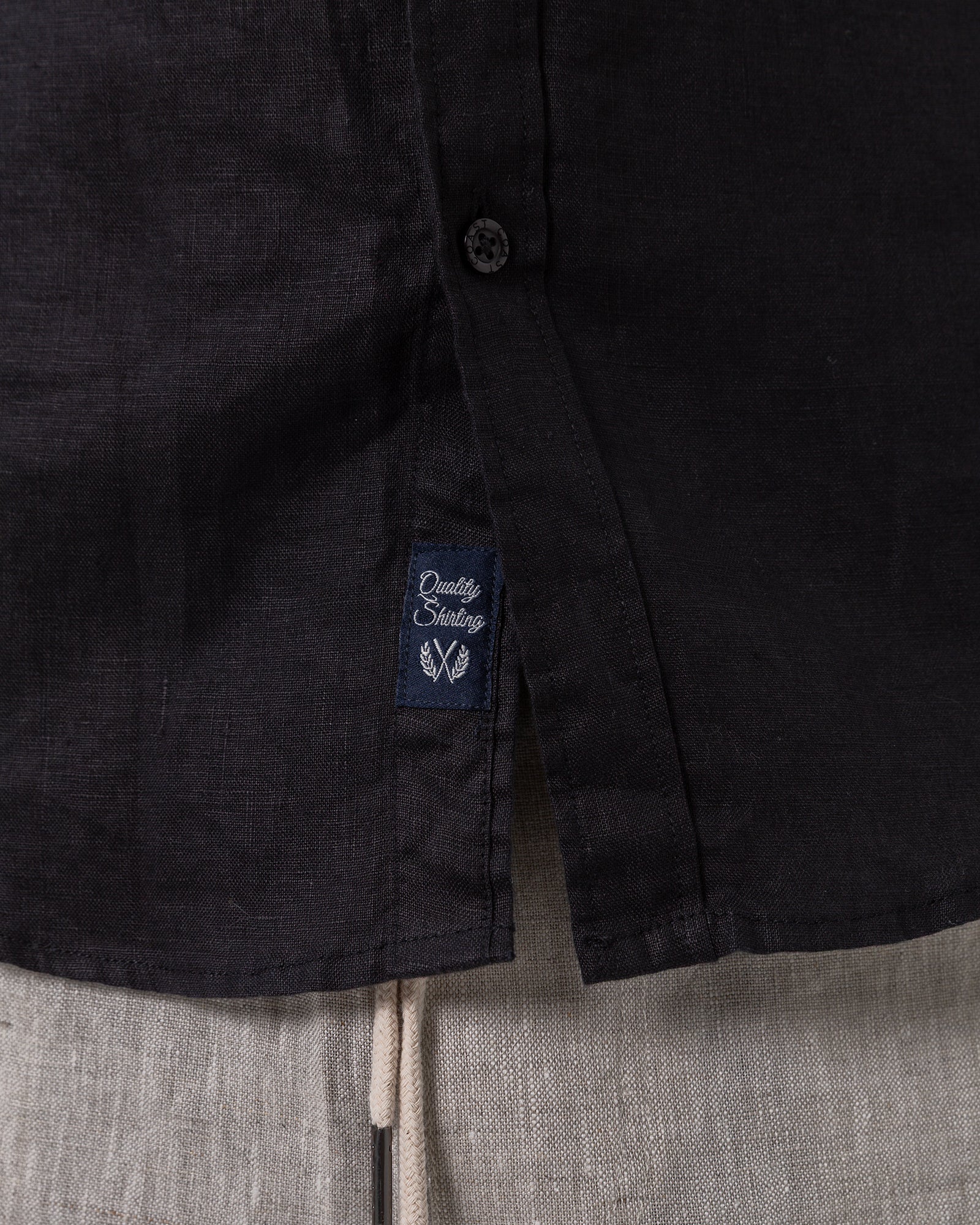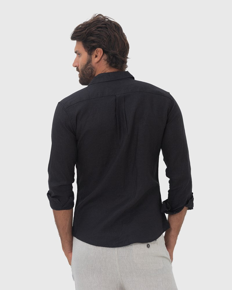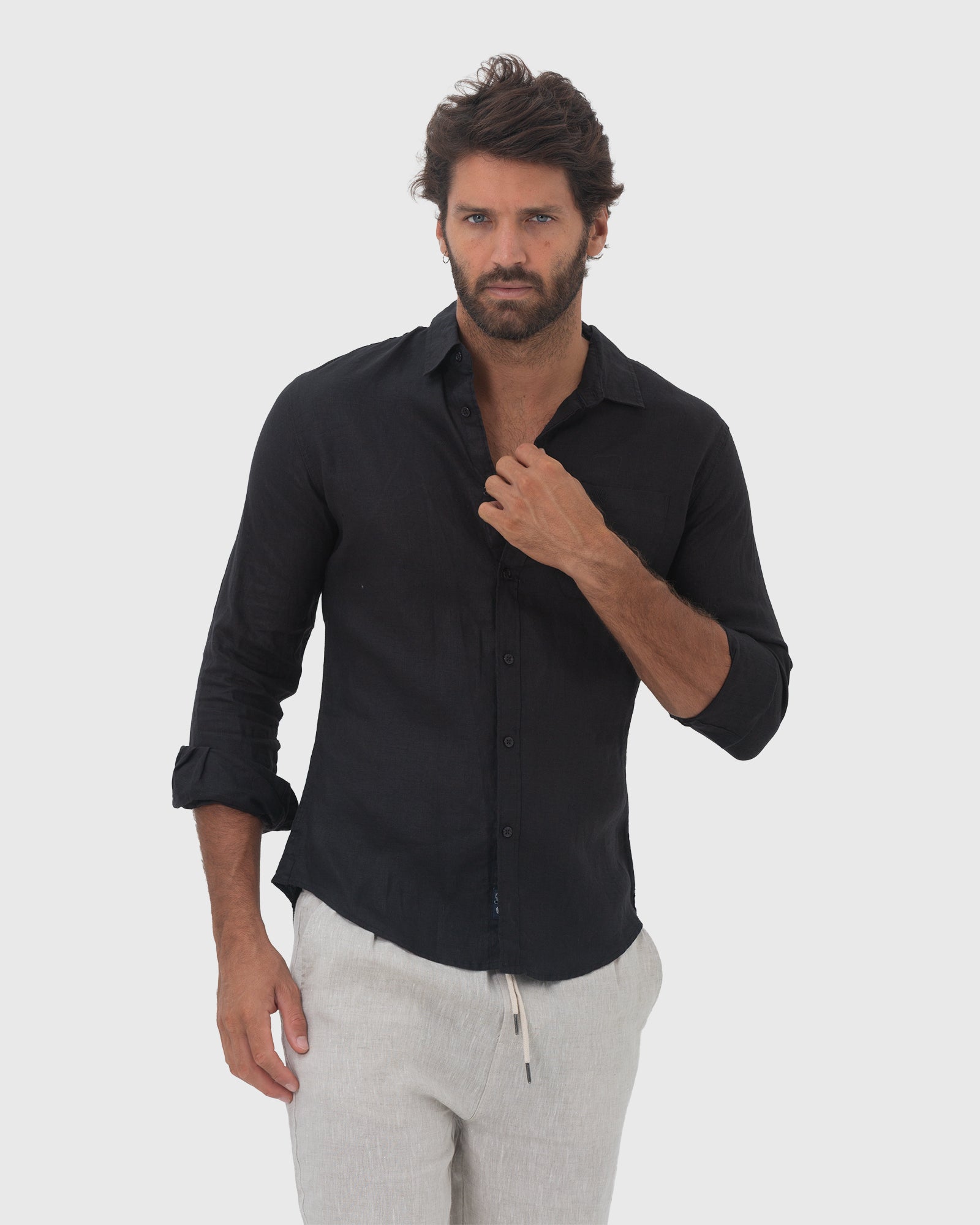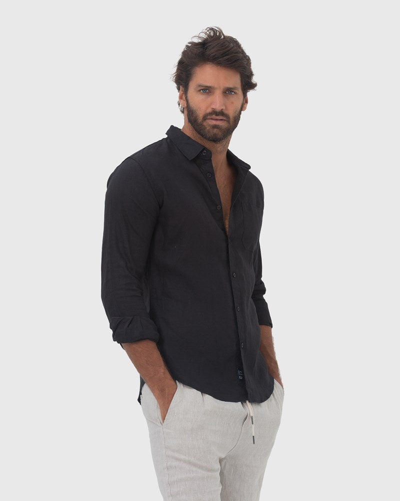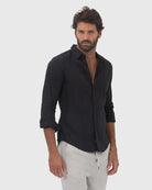 Crafted from breathable French linen, this black shirt features a straight fit, classic collar, and button-through front. A sleek, versatile essential for smart-casual or coastal wear.