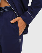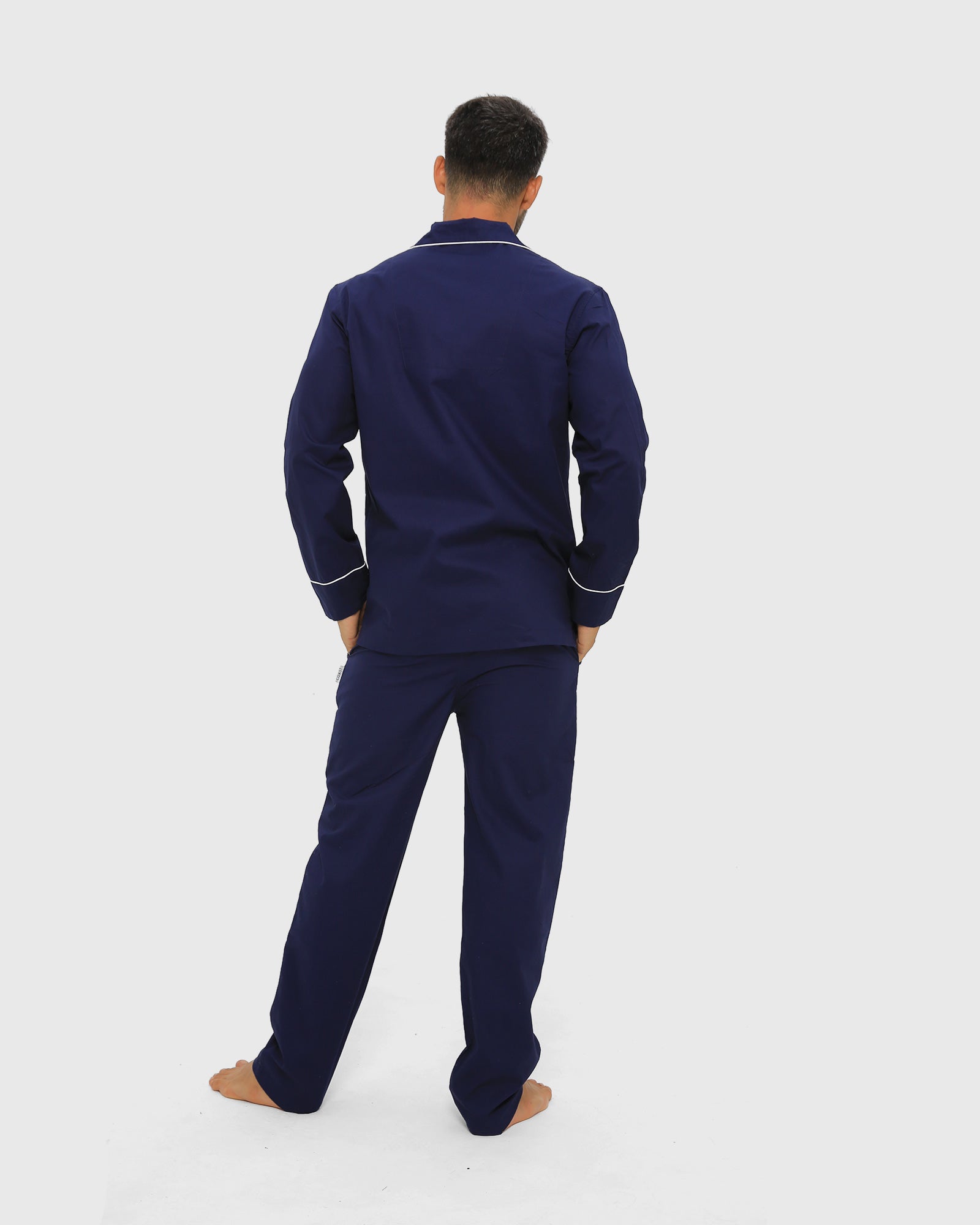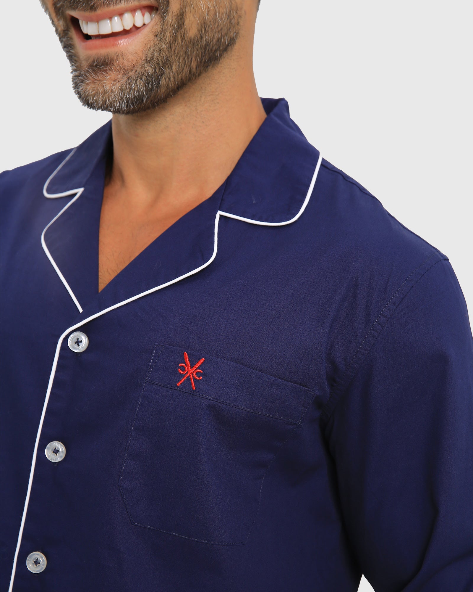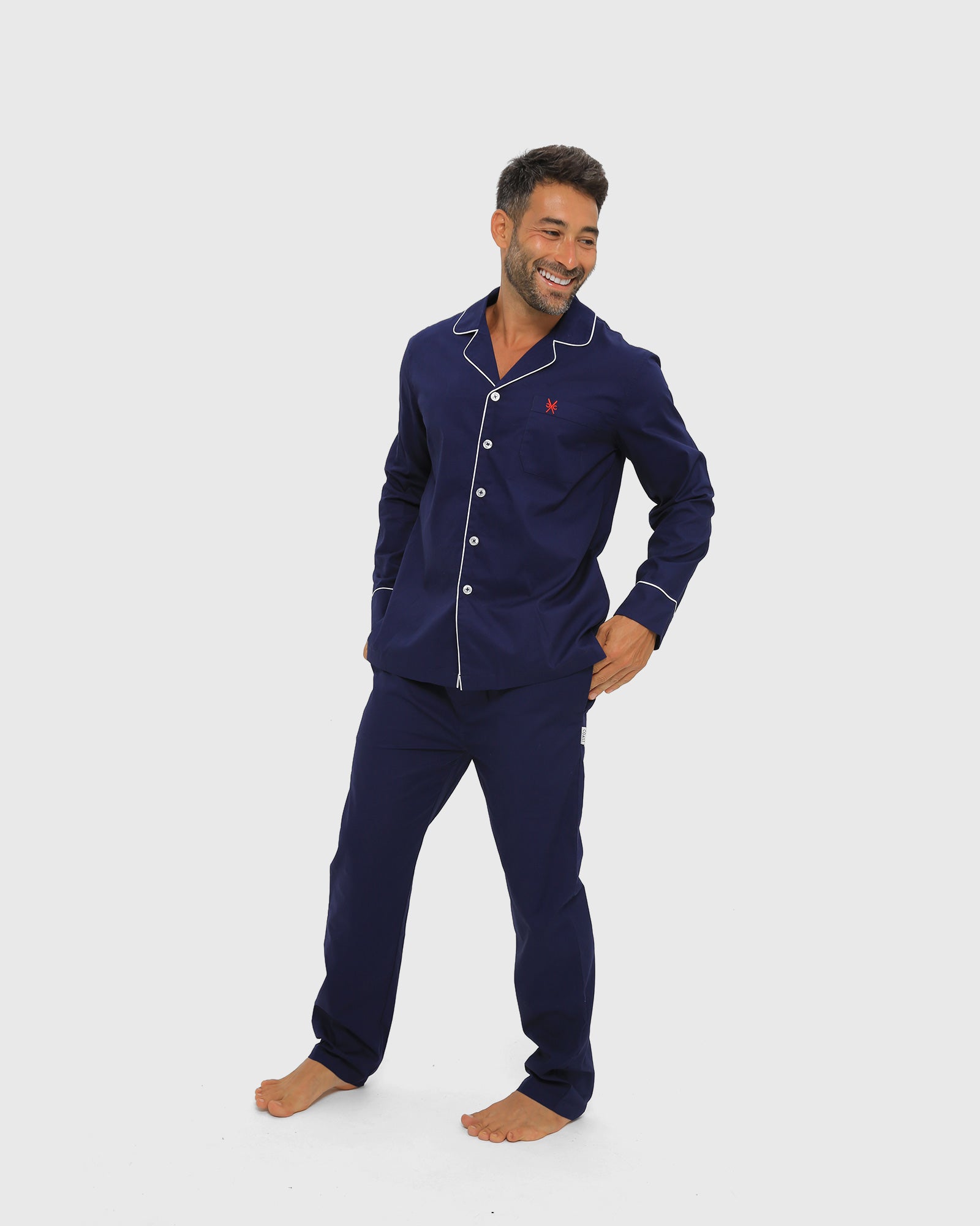 Sleep in style with the New York PJ Set, crafted from 100% cotton poplin for lightweight comfort. Designed with satin piping, a button-up long sleeve top, and relaxed straight-fit pants, it’s your go-to for elegant lounging.