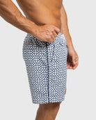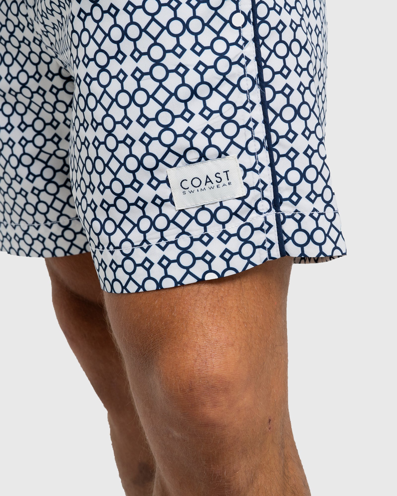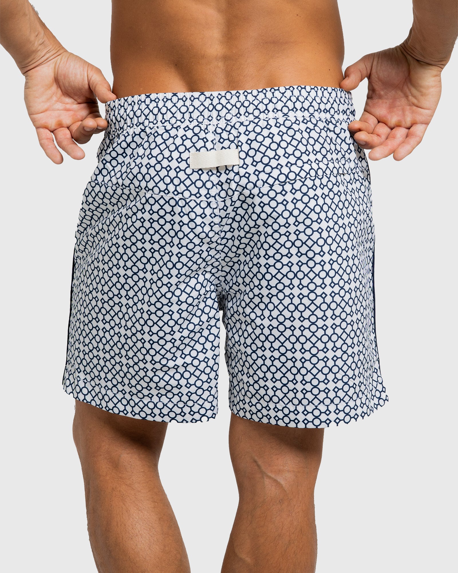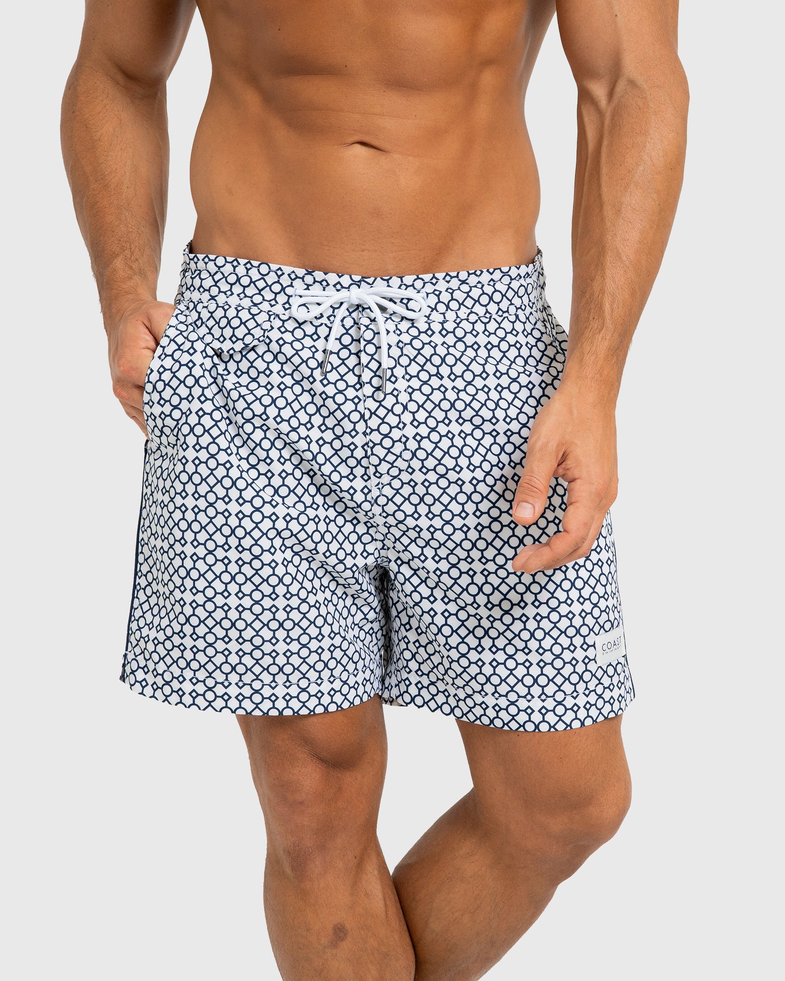 Crafted from 100% recycled polyester, these quick-dry swim shorts feature a stylish navy circle print, flat-front waistband, mesh brief, and multiple secure pockets. Designed for modern comfort with a refined coastal look.