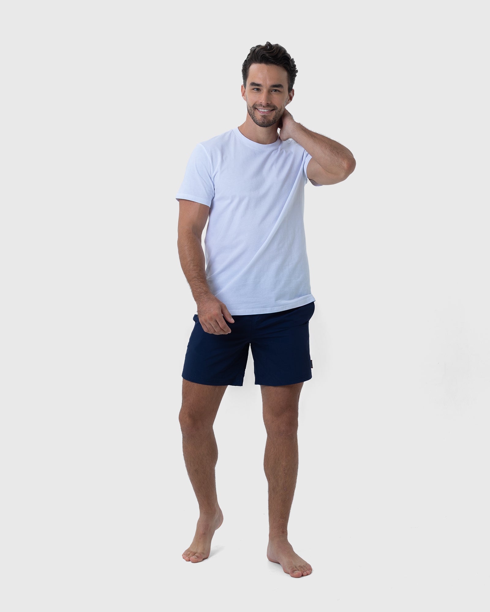 The Essential Navy Swim Shorts showcase an array of features that set them apart, combining fashion-forward design with practicality. Our featured model confidently sports a size medium (AU), standing at an impressive height of 186cm (6'1"), with a chest circumference of 104cm (40") and a waist measurement of 86cm (33").
